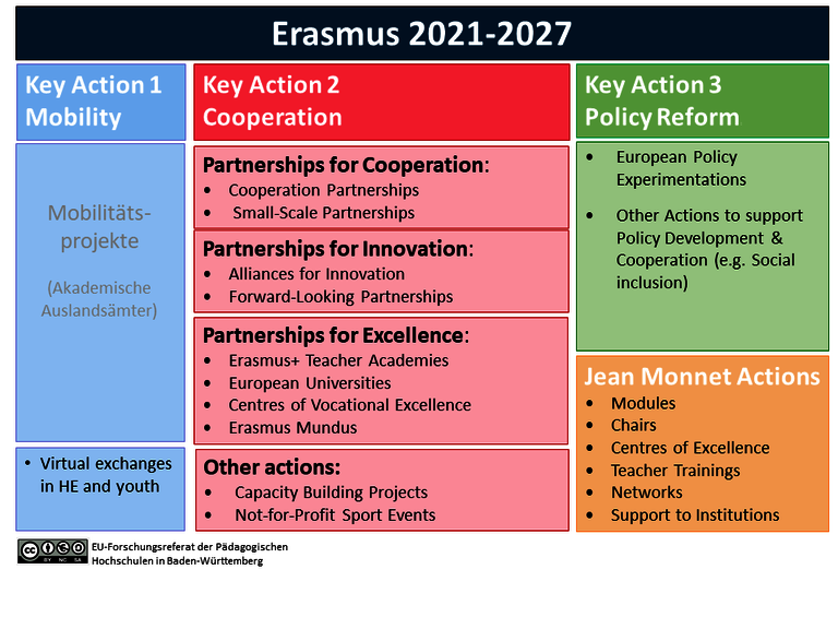 In ERAMUS + gibt es drei Leitaktionen / Key Actions, sowie zwei spezielle Programme für den Bereich der Europäischen Integration und des Sports: